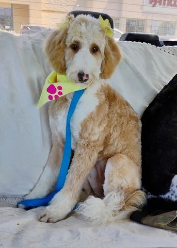 I am Emmy. I am a multigenerational Goldendoole. I was born August 14, 2025. I am up to date on my vaccinations and have started monthly heart worm/flea/tick treatment. I am crate and potty trained. I love to play and just got my first "big girl" haircut and did a good job at the groomers. I still get a little nervous riding in the car bu
