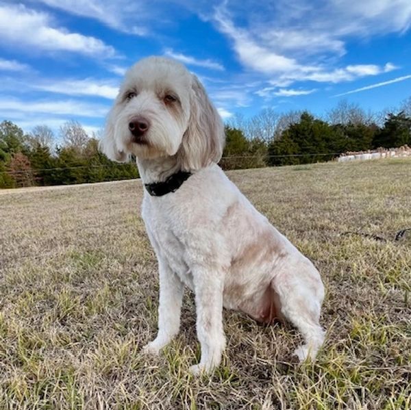 Winnie is our Goldendoodle. She is as fast as lightning and likes to "race" and play with the other dogs. She loves to play with her toys, if you go check in her bed, you’ll find she likes to horde them all to herself. Winnie is gentle but reserved, and often prefers to lie at your feet rather than cuddle.